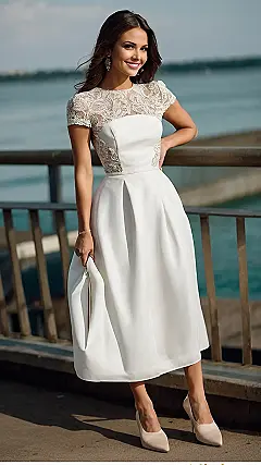 This dress is like a fairytale come true! Imagine strolling along a beautiful bridge, feeling like a princess in your super cute, simple dress. It’s got that perfect mix of elegant and comfy – fancy enough to make heads turn, but easy enough to wear all day long. The lace top is like a delicate whisper, and that skirt just flows beautifully. You’d be the prettiest girl at any party or event – maybe even better than the flowers!