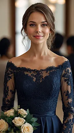 Getting that wedding invitation often sparks the immediate quest for the perfect outfit! Because, let’s be honest, showing up in your favorite sweatpants (or even your coolest ripped jeans) is probably a no-go, unless you’re aiming for a viral meme moment. This stunning navy blue dress, with its delicate lace sleeves and off-the-shoulder elegance, is practically a masterclass in wedding guest style. It says, “I put effort into this, but I’m definitely not trying to outshine the happy couple” – which, news flash, is the golden rule of wedding attire.