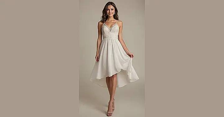 This dress isn’t just practical; it’s a total head-turner too! The pretty lace on the top gives it a fancy vibe, while the flowy, high-low skirt is just begging for you to make an entrance. It’s that sweet spot where you look effortlessly put-together, but secretly you’re just thrilled you won’t accidentally drag a train of chips across the floor. So go ahead, rock that party with confidence, knowing you’re perfectly dressed for fun – and maybe even a spontaneous conga line!