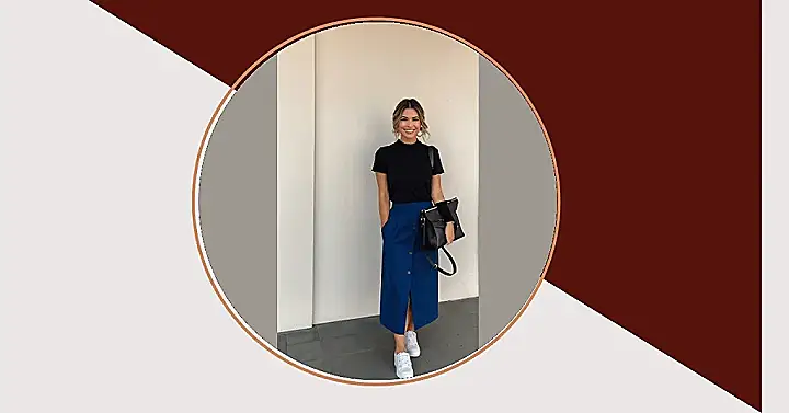 This girl’s totally rocking the “midi skirt with sneakers” look! It’s like she’s saying, “I’m comfortable, stylish, and ready to conquer the world – one perfectly placed button at a time!” That bright blue skirt is seriously eye-catching, and the white sneakers give it that perfect balance of casual chic. Who needs heels when you’ve got this much awesome?
