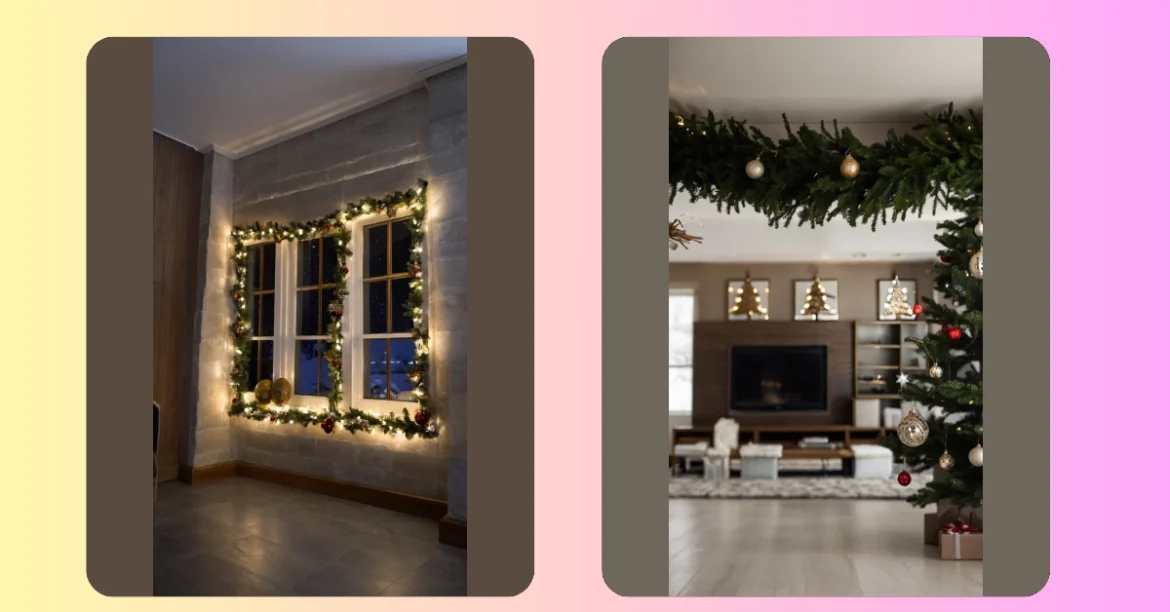 This picture is pure Christmas magic! Just imagine strolling into this cozy living room, with a giant garland draped across the ceiling like a sparkly, evergreen river. It’s like the Christmas tree decided to go for a swim across the room, bringing its shiny, golden, and sparkly red ornaments along for the ride! Who needs a fireplace when you’ve got twinkling lights and festive greenery everywhere?
