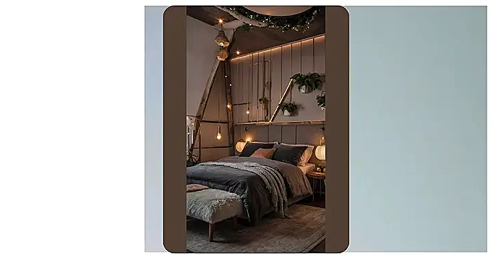 The wooden shelves overflowing with plants, books, and family photos add a personal touch, making the space feel warm and inviting, rather than sterile and boring. It’s the kind of room where you can truly relax – maybe read a book, or binge-watch your favourite show, or just blissfully doze off amidst the soft glow of the fairy lights. The whole vibe screams “ultimate chill zone,” and honestly, I’m already planning my own comfy cozy bedroom makeover inspired by this picture.
