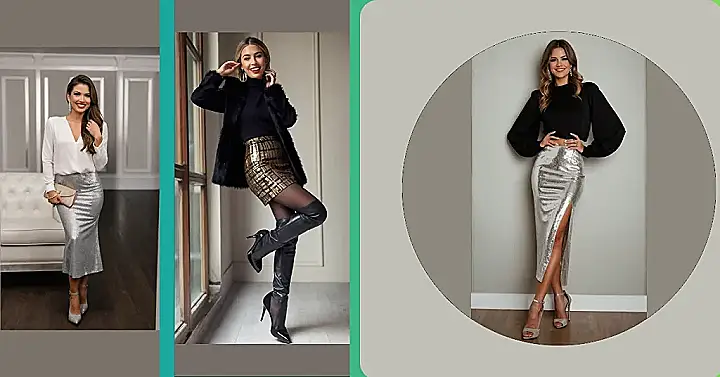 This outfit is seriously sparkle-tastic! Imagine walking into your office holiday party, and everyone’s jaw drops because you look absolutely stunning. This shimmering silver skirt and chic black top combo is like a disco ball met a sophisticated librarian—the perfect mix of fun and “I mean business.” You’ll be the most dazzling person in the room, and let’s be honest, who doesn’t want that?