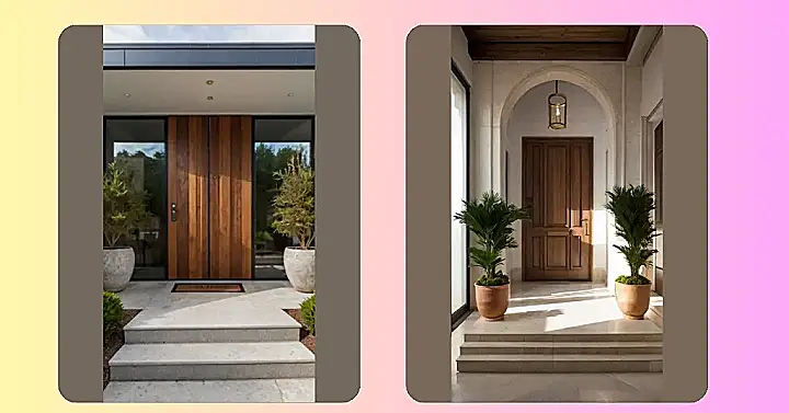 Wow, check out this entrance! It’s like stepping into a fancy magazine spread, but way more welcoming. That gorgeous wooden door is practically begging you to come inside and explore. And those plants on either side? They’re like the door’s stylish best friends, adding a pop of green and making the whole thing feel super inviting. It’s the kind of entrance that makes you want to ring the doorbell just to say hi, even if you don’t know who lives there!
