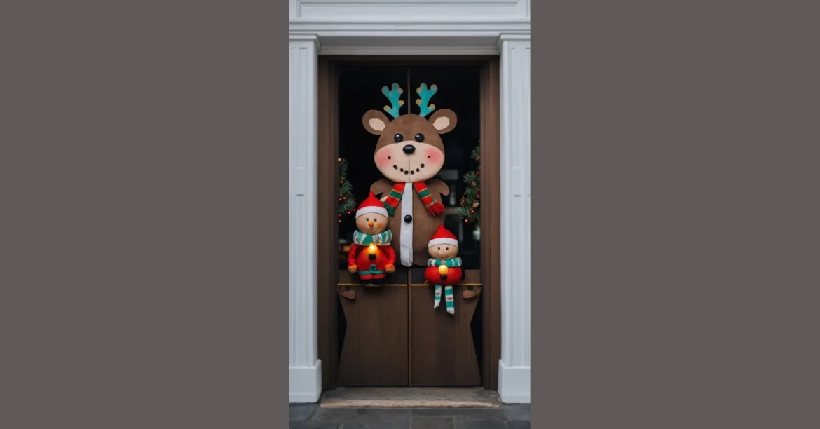 This Christmas, our door decided to host a reindeer rave! A super-cute, fluffy reindeer is the star of the show, sporting a snazzy scarf and antlers that look like they’re ready to light up the night. He’s got two adorable snowman pals joining the party, each with their own little glow, like tiny Christmas lightbulbs come to life. It’s a festive, fun, and frankly, very stylish way to welcome all the holiday cheer!