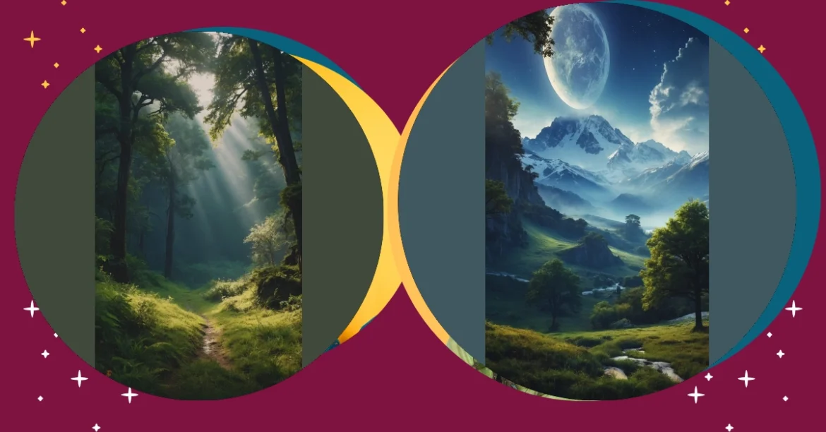 This picture is like a seriously awesome screensaver—but way better! Imagine having this dreamy landscape as your wallpaper. It’s got everything: a giant moon that looks like it’s about to drop into a valley full of lush green hills, a snow-capped mountain range that’s totally majestic, and a little stream winding its way through it all. It’s the kind of view that makes you want to pack a picnic basket and just chill for hours. Who needs reality when you’ve got this kind of fantasy view?