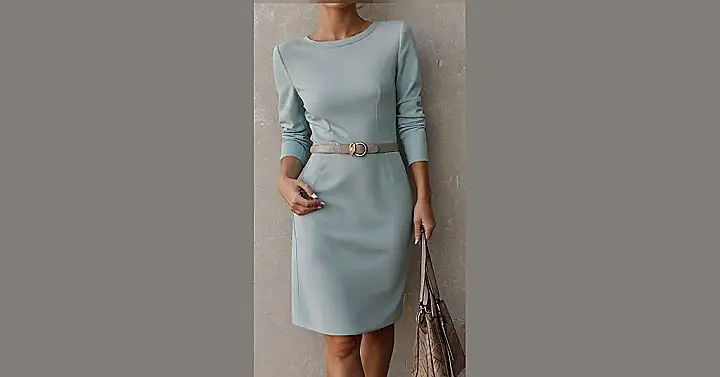 This pale blue dress is like a magic potion for your wardrobe! It’s the perfect blend of sophisticated and stylish, proving that you can be comfortable and look amazing at the same time. Forget frumpy – this dress is all about sleek lines and a flattering cut that’ll make you feel confident and ready to take on the world, regardless of what number is on your birthday cake. Plus, that little belt is the cherry on top – it adds a touch of elegance without being fussy, like having the perfect accessory to complete a look that screams, “I’ve got this!”