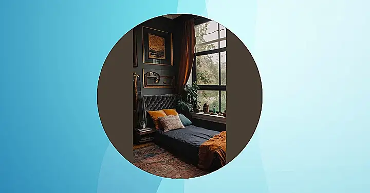 This bedroom isn’t just relaxing; it’s like stepping into a cozy, grown-up fairytale! Imagine sinking into that plush bed, surrounded by gorgeous pillows in warm, autumnal colors. The dark walls and gold accents give it a sophisticated vibe, kind of like a secret hideout for a super-stylish prince or princess. The big window lets in tons of sunshine (or moonlight!), perfect for daydreaming or catching some serious Zzz’s. You could almost hear the whispers of ancient magic emanating from that gorgeous rug.