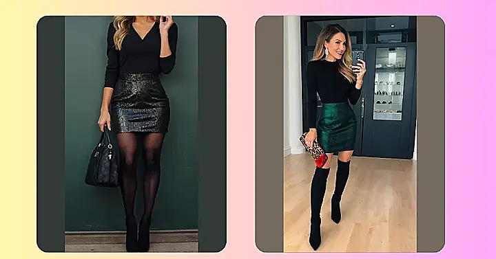 This outfit is seriously office holiday party goals! Imagine walking into that festive gathering, all confident and stylish in your sleek black turtleneck and super cool snakeskin mini-skirt. Forget the awkward reindeer sweater – this look says “I’m here to celebrate, and I’m doing it in style!” Those thigh-high boots are the cherry on top, adding a touch of mystery and making you feel like a total boss. Who needs mistletoe when you have this much awesome?