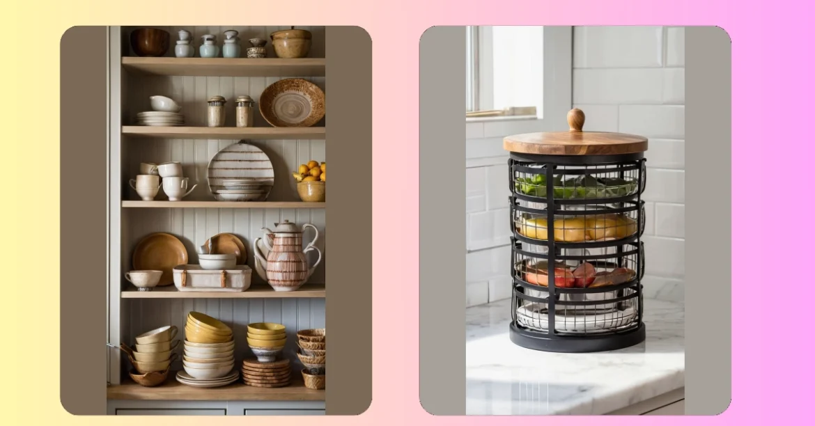 This isn’t your grandma’s fruit bowl! Check out this amazing kitchen decor item – it’s like a stylish, multi-level cage for all your favorite snacks and produce. Imagine: perfectly organized lettuce, cheeses that look like they’re posing for a magazine photoshoot, and peaches so vibrant they almost glow. It’s functional, beautiful, and adds a serious “wow” factor to your kitchen counter. Forget those boring, old bowls; this is where it’s at!