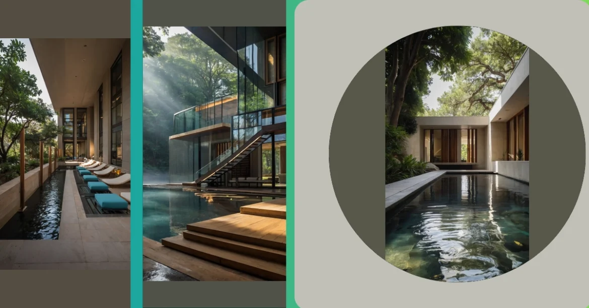 Imagine this: you’re chilling by a pool, surrounded by trees that look like they’re whispering secrets. The building is sleek and modern, like something out of a spy movie (but way more peaceful), and the water is so still it’s like a giant mirror showing off the sky. That’s what “serene architecture” means – a place designed to make you feel super relaxed and calm, like you could just float away on a cloud of pure tranquility. It’s like nature and awesome design had a baby, and the baby is this incredibly peaceful backyard oasis!