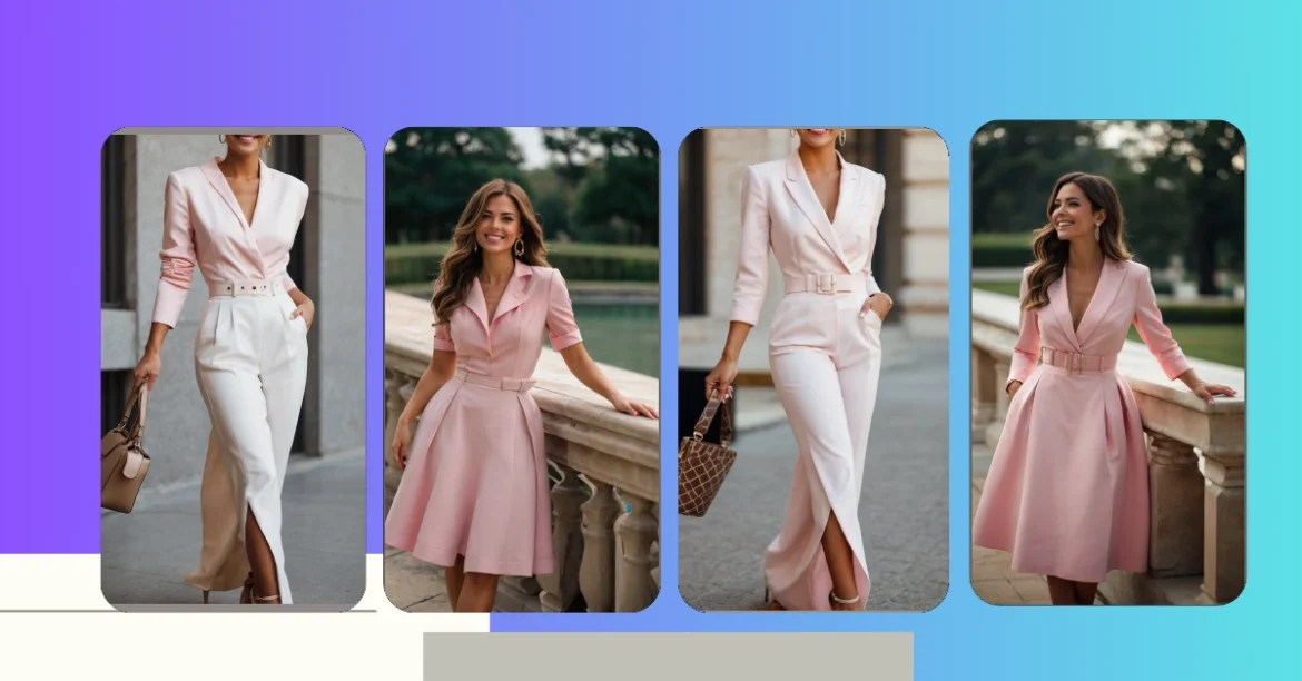 This lady is rocking a pink outfit that’s totally chic! It’s like a blazer and a dress had a baby, and that baby is absolutely adorable. The color is perfect – not too bright, not too pale, just the right shade of “I’m ready to conquer the world (but first, I’m getting a cupcake).” This outfit would be amazing for a party, a fancy dinner, or even just hanging out and making people jealous of your fantastic fashion sense.