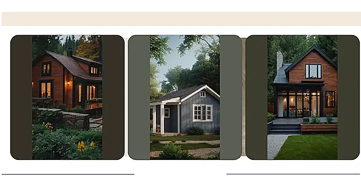 This small house design is seriously stylish! It’s like someone took a sleek, modern spaceship and landed it gently in a suburban garden. The dark grey and rich brown wood make it look super sophisticated, but those cute little lights above the door? Pure charm! I bet living here feels like you’re in a grown-up treehouse—but with way better Wi-Fi, I’m guessing.