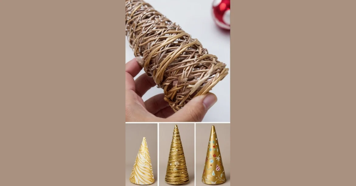 Get ready to ditch the store-bought decorations and unleash your inner artist! This isn’t your grandma’s Christmas crafting – we’re talking seriously adorable miniature Christmas trees that are way easier to make than you think. The image shows how you can transform simple wicker cones (which look like something a tiny gnome would build!) into festive masterpieces. Just imagine the possibilities: gold glitter, swirling patterns, even a tiny snow-covered village scene – all on teeny-tiny trees perfect for your desk, a festive centerpiece, or even a super-cute stocking stuffer! Prepare for compliments and maybe even a little Christmas crafting envy from your friends.
