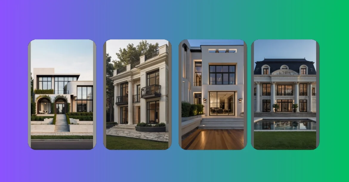 This house is like a total upgrade on a classic! Imagine a super sleek, dark-chocolate building with fancy details that remind you of old-timey palaces, but with a super modern twist. It’s got those tall, arched windows – like something out of a fairytale – letting in tons of light, but also huge glass doors that lead straight to a sparkling pool. It’s like a stylish blend of “old-school cool” and “new-school fabulous.”