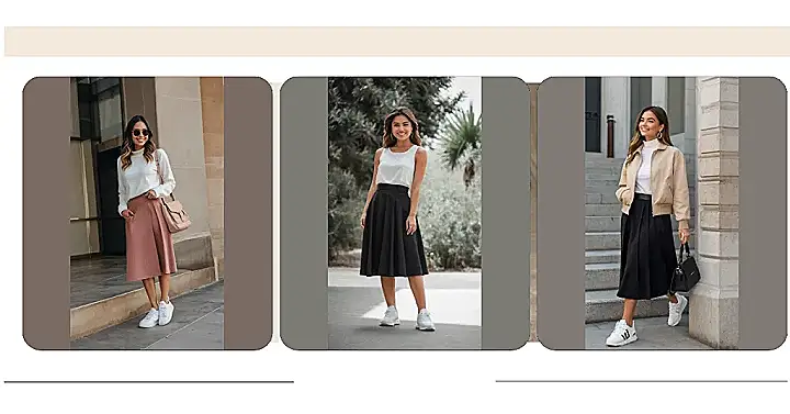 This look is all about proving that comfort and style can totally hang out together. Who knew a flowy midi skirt could look so amazing with a pair of comfy sneakers? It’s like the perfect blend of dressed-up and dressed-down – perfect for a casual Friday at school, grabbing coffee with friends, or even a low-key date. Forget struggling with heels all day – these kicks are your new best friend!