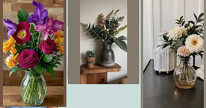 Seriously, though, look at those colours! They’re like a party in a vase, and everyone’s invited. From the cheerful orange blooms to the elegant deep reds, every flower has its own unique personality – it’s like a mini flower-powered superhero team working together to make your home a happier, more colourful place. This isn’t just about flowers; it’s about bringing a little bit of nature’s awesome design skills into your own space, proving that sometimes the best home decor is the simplest.