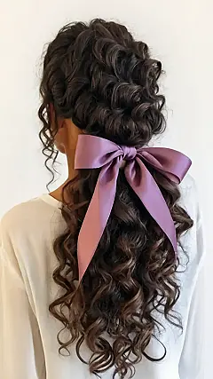 The picture shows a person with amazing curly hair. It looks like they spent hours getting ready for a special occasion. The big, purple bow is a perfect touch! It’s like something out of a fairytale, right? Can you imagine all the compliments they’re going to get? Maybe you can even try out a similar look with your own hair. It’s just a matter of getting creative and having fun! Don’t be afraid to experiment with different styles and colors. Maybe you’ll find your own signature look!