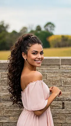 The picture shows a girl with gorgeous curly hair. She’s got it pulled back in a high ponytail, but even with that, her curls are bouncing all over the place. She’s rocking a super cute off-the-shoulder pink dress that looks like it’s made of clouds. You know how sometimes you see someone with amazing hair and you just want to run your fingers through it? That’s this girl. She’s got that whole “I woke up like this” vibe, but let’s be real, it probably took her a lot of effort to make her hair look this good.