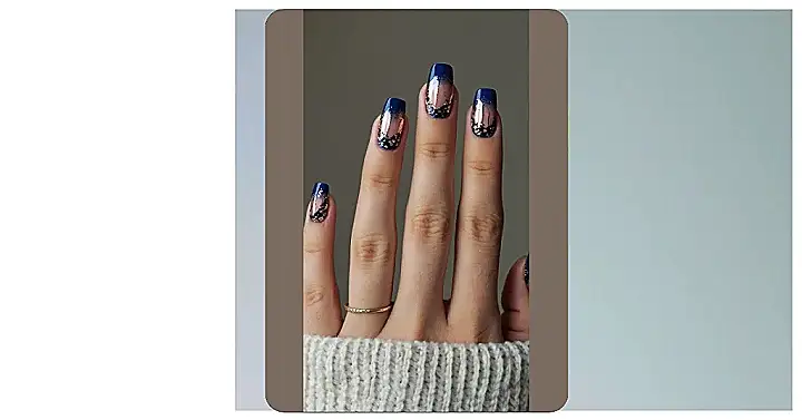And those rings! They’re delicate and sparkly, and they look great against the dark blue. The whole look is super chic, like you stepped right out of a magazine. So if you’re looking for a new nail design that’s both cool and stylish, look no further than this blue-tiful look!