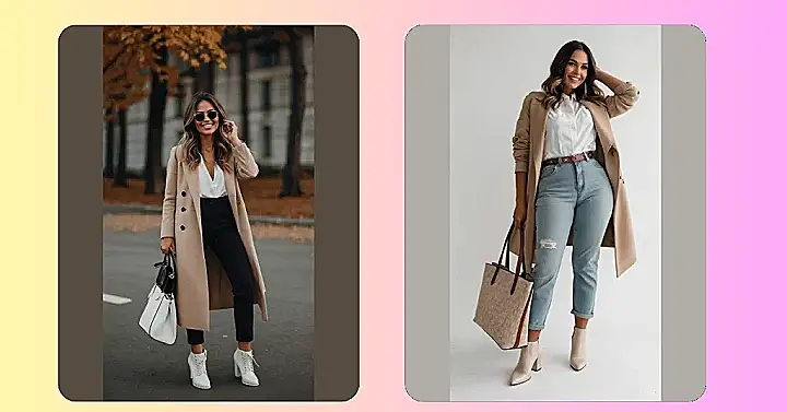 This outfit is like a warm hug on a chilly autumn day. The camel coat is totally giving us cozy vibes, and the light-wash denim is the perfect way to break up all the brown. It’s like that one friend who always knows how to bring the perfect balance to a situation, you know?
