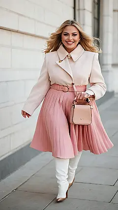 This lady is rocking a super cute outfit and showing everyone that plus size fashion is anything but boring! She’s got a killer pink pleated skirt that’s totally flowy and chic. It’s like a giant, stylish cupcake, and who doesn’t love cupcakes? She’s even got a cute little purse that perfectly matches her skirt. It’s like a cherry on top of a delicious outfit!