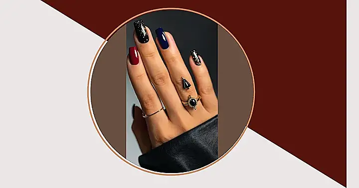 This picture screams Halloween, but with a fancy twist! It’s like a witch went to a fancy dress party, but instead of a long black gown, she opted for a sleek black jacket. Her nails are painted in the colors of the night, deep red and dark blue, like the most perfect Halloween combo. The rings on her fingers add a touch of bling, and the blue gemstone sparkles even in the darkest of nights.