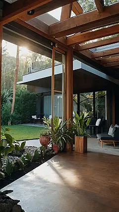This picture shows a beautiful house with a big, open patio that looks like the perfect place to relax. The wooden beams overhead are like a giant, comfy canopy, and you can just imagine the sun shining through those glass doors, warming the whole space. It’s like a secret garden oasis right in your own backyard!