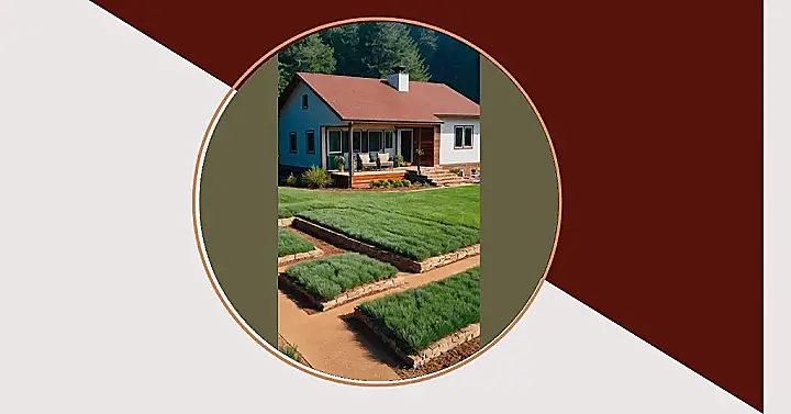 This house is seriously cool, like a super modern treehouse perched on top of a giant green hill! It’s got a pool, a view, and even a fancy garden that looks like someone took a giant pair of scissors and cut out neat little squares in the grass.