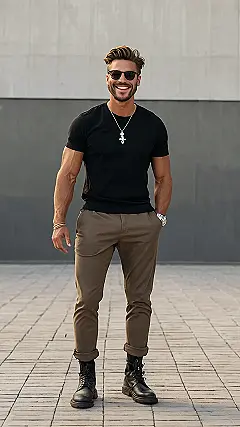 This guy is totally rocking the simple look, and it’s super easy to copy! Just imagine yourself walking down the hall in school wearing a comfy black t-shirt and some stylish khaki pants. Throw on some cool boots, and BAM – you’re looking sharp. The key here is keeping it simple, so you can focus on being confident and having fun with your friends. This look is all about feeling good in your own skin, and let’s face it, who doesn’t want to feel confident and comfortable at the same time?