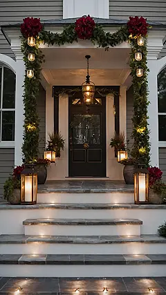 And let’s be real, in December, when it gets dark super early and it’s freezing, these outdoor lights aren’t just for looking pretty. They’re basically your home’s way of saying, “Hey, watch your step, there’s a staircase here!” Those little lights built right into the steps are genius, preventing awkward tumbles and making sure everyone (especially clumsy gift-bearers) can navigate safely. Plus, all those warm glows from the lanterns and hanging jar lights just make everything feel cozy, even when the outside air is biting your nose. It’s like a warm hug for your eyeballs before you even make it to the hot cocoa inside.