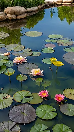 This picture is like a real-life screensaver! Imagine chilling by this serene garden pond, watching the water lilies bob gently. It’s so peaceful, you could almost forget about that algebra test looming over your head. Those pretty pink and yellow flowers look like they’re posing for a magazine cover — they’re definitely more stylish than my last attempt at a science fair project.