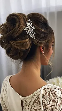 That hair updo is like a five-star masterpiece! Seriously, it’s so smooth and elegant, it looks like a professional artist sculpted it out of strands of hair. Plus, that sparkly headpiece is giving off major fairy-tale vibes, like she’s a princess ready to marry her prince charming. Now, if only I could figure out how to make my messy bun look half as good on a normal Tuesday!