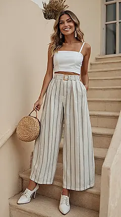 Check out this vibe! Those wide-leg linen pants with the stripes are serving serious comfy-chic energy. It’s like wearing clouds on your legs, but way more stylish. Paired with a cute crop top and a tiny straw bag that probably only fits chapstick and a single emergency gummy bear, this look says “I’m ready for sunshine and not sweating buckets, thank you very much.” This outfit basically gives you permission to look amazing while feeling like you’re still in your comfiest clothes.