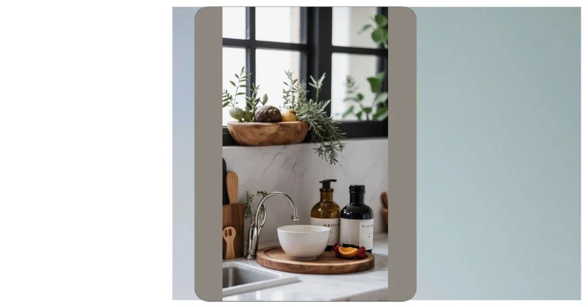 And who knew the area around the sink could look so good? Usually, it’s just soap scum and forgotten sponges, right? But here, a stylish faucet, a cute wooden board, and even those super fancy-looking bottles of soap make doing dishes seem a little less dreadful. Plus, that slice of orange and a few berries aren’t just for decoration; they’re basically a sneaky, healthy snack waiting to happen. This setup shows that simple kitchen decor is all about making everyday things look extra special, so you can impress everyone (or just yourself) without even trying too hard.