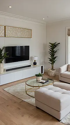 Look at that giant TV – it’s practically begging for a major streaming marathon or an epic gaming session. And that squishy-looking ottoman? Ideal for kicking up your feet after a long day of… well, whatever keeps you busy. Plus, those plants add a touch of ‘fancy adult’ without requiring you to remember to water them (hopefully they are the low-maintenance kind!). All these little details pile up to create a space that’s both super stylish and looks genuinely fun to hang out in, giving you tons of ideas for your own spot.