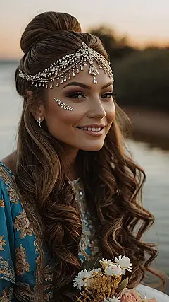 Want to look like you walked straight out of a fairy tale on your big day? Check out this awesome hairstyle! That blingy headband is like a crown for your hair, and those loose curls are giving major princess vibes. It’s fancy, but also looks comfy enough to dance all night without your head feeling like it’s about to explode. Plus, those little sparkly things near her eye are like, next-level glam!