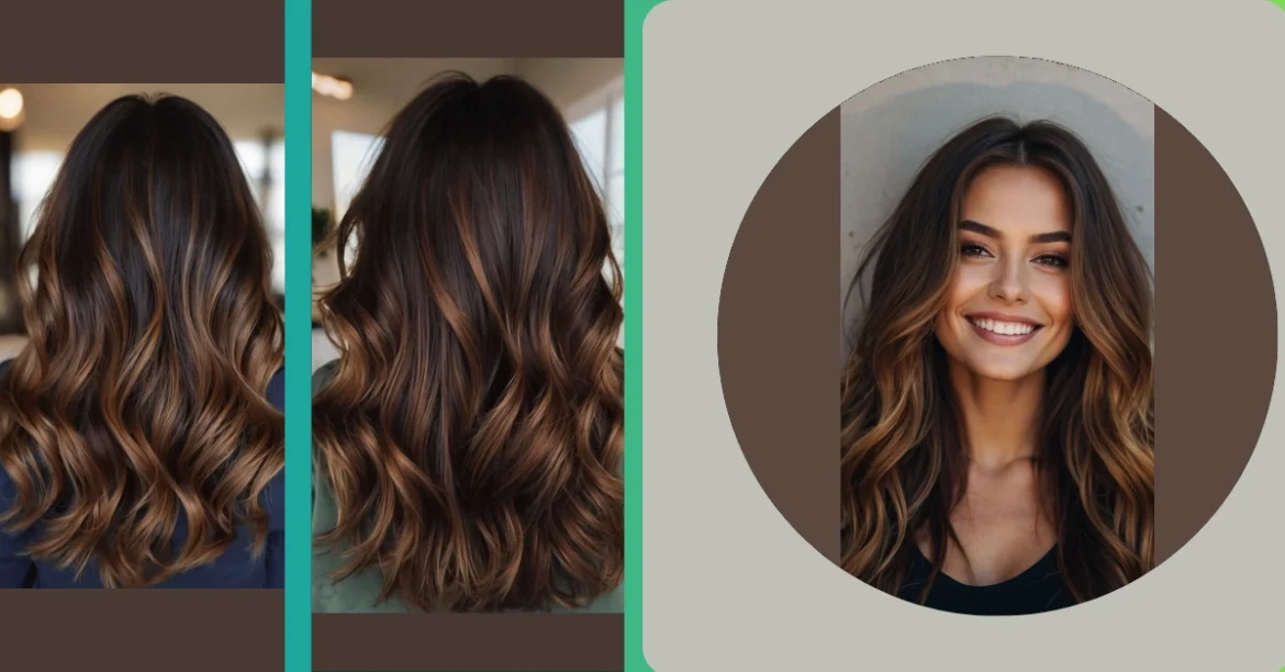 The picture shows hair that looks like a warm hug for your locks. It’s all about beautiful brown hair with streaks of lighter brown, like the leaves changing color in the fall! It’s like taking the best parts of summer, those golden rays of sunshine, and bringing them to your hair.