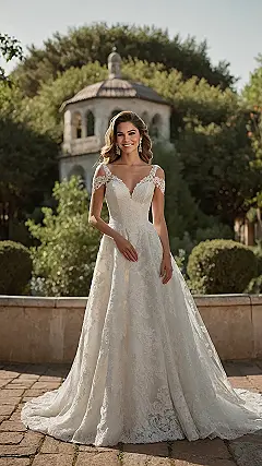 This white bridal dress is like, totally fairytale vibes, right? With the lace details and the flowy skirt, it’s the kind of dress you imagine wearing while a string quartet plays and your future spouse is crying (happy tears, of course!). You could twirl in it for hours, even if you stepped on it a little.