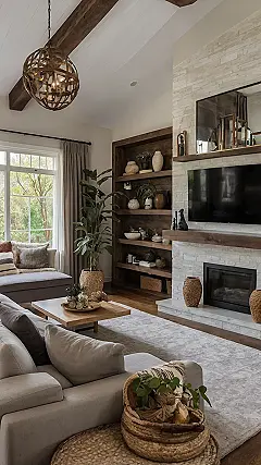 Stepping into this living room is like getting a sudden urge to clean your own bedroom, which, let’s be real, is probably a disaster zone of clothes and forgotten snacks. This place is so ridiculously classy, with its giant comfy couch and those cool exposed beams on the ceiling, you half expect it to start judging your TikTok dance moves. Seriously, it’s the kind of room where even the fire logs are perfectly stacked, probably whispering secrets about immaculate cleanliness to each other.