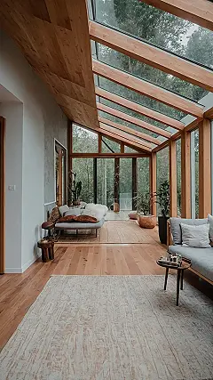 Just look at those sofas – they’re practically begging you to sink in and watch a terrible reality show marathon, or maybe just stare at the trees and pretend you’re deep in thought for a philosophy class. All that natural wood and those fluffy pillows make it feel like the most grown-up fort ever. Plus, with all those plants, you’re basically a plant parent by default, without any of the actual watering responsibilities. Who needs a messy bedroom when you can have this minimalist, nature-infused escape where the biggest decision is whether to grab the fuzzy blanket or the *extra* fuzzy blanket?