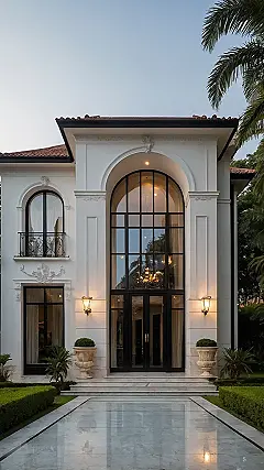 Step right up to this neoclassical villa that looks like it just rolled out of a history book, except way more polished. Seriously, check out that massive arched window! It’s so big, you could probably screen movies on it. And the front door looks like it’s waiting for someone important to walk out, maybe wearing a cape or carrying a scepter. With those grand pillars and fancy decorations, it’s like the house is putting on its best suit and tie just for you. You almost feel like you need a formal invitation to even stand on that super shiny marble walkway.