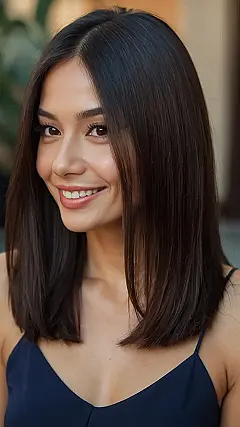 This woman is rocking a seriously sleek hairstyle! Her hair is so smooth and straight, it practically shines like silk. It’s like she just stepped out of a hair commercial, but with a more natural and effortless look. And with that bright smile, you’d think she just got the best news ever!