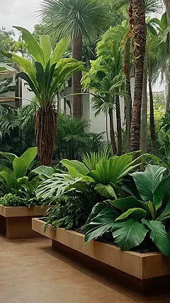 I bet those planters are made from super durable materials because those plants look like they’re ready to take over the world! It looks like someone really put a lot of effort into selecting the right plants for each container. They chose plants that all complement each other, creating a harmonious look that’s almost too beautiful to be real. It’s the kind of design that would make you want to grab a lounge chair and soak up the sun! The planters make the whole scene feel more structured and organized, but still totally tropical and inviting.