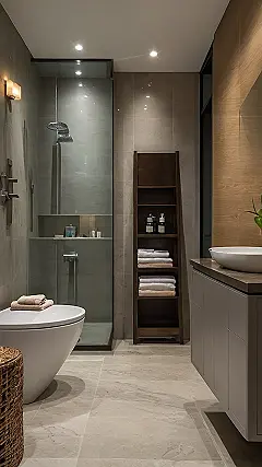 Check out the earthy tones and subtle lighting – it’s all about creating a chill vibe. They’ve even got those woven baskets up on the shelves, probably holding fancy bath bombs or maybe even secret stash of snacks. You could spend hours in here, soaking away your worries and emerging feeling totally refreshed and ready to tackle anything, even homework. Just try not to fall asleep in the tub!