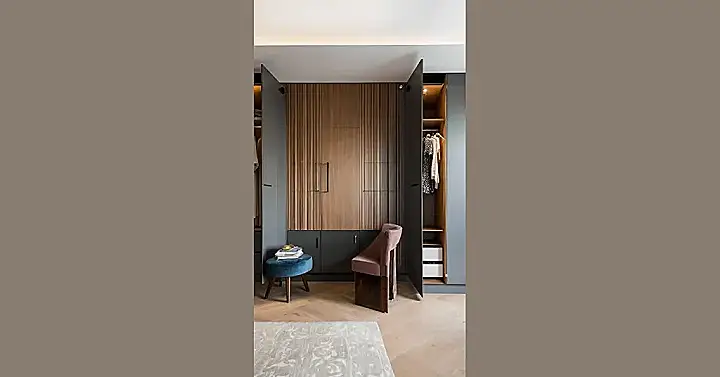 This wardrobe is like a fashion runway for your clothes! Imagine you wake up in the morning, open the closet doors, and suddenly it feels like you’re in a high-end boutique. The sleek dark grey doors, the warm wooden accents, and even the little chair make you feel like you’re in a fancy magazine. The inside is organized perfectly too, so you can find what you’re looking for without digging through a pile of clothes. This wardrobe is the ultimate dream for anyone who loves fashion and wants their bedroom to feel like a luxurious haven.