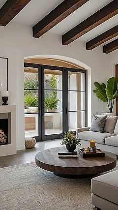 Stepping into this living room is like getting a sudden urge to clean your own bedroom, which, let’s be real, is probably a disaster zone of clothes and forgotten snacks. This place is so ridiculously classy, with its giant comfy couch and those cool exposed beams on the ceiling, you half expect it to start judging your TikTok dance moves. Seriously, it’s the kind of room where even the fire logs are perfectly stacked, probably whispering secrets about immaculate cleanliness to each other.
