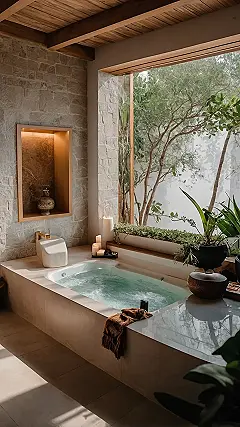 Forget your regular five-minute shower; this is where you go to actually *chill*. Picture this: warm water bubbling around you in that awesome jacuzzi tub, gentle light from those cool candles, and leafy trees swaying outside, making you feel totally zen. This isn’t just a place to get clean; it’s a whole vibe! You’d probably spend so long unwinding that your fingers would look like raisins, but honestly, it would be totally worth it. Good luck trying to drag yourself out of this deluxe dreamland!