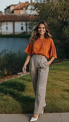 Imagine strutting through Istanbul’s Grand Bazaar rocking this outfit! You’d definitely turn heads. The high-waisted pants are super classy, and the brown top adds a pop of color, like the spices you’d find piled high in the market. With the right shoes you’ll be ready to haggle for souvenirs, sip Turkish coffee, or just look awesome posing for pics in front of the Hagia Sophia.