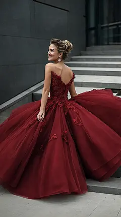 That dress is seriously amazing! It’s like something a princess would wear to a super fancy ball, except maybe a little more awesome. The color is like a rich, deep red wine – perfect for feeling like royalty without actually having to curtsy to anyone (unless you want to, of course!). Imagine twirling around in this ball gown – you’d probably accidentally sweep up everyone in a 10-foot radius. Who needs a dance partner when you’ve got this much fabric to work with?